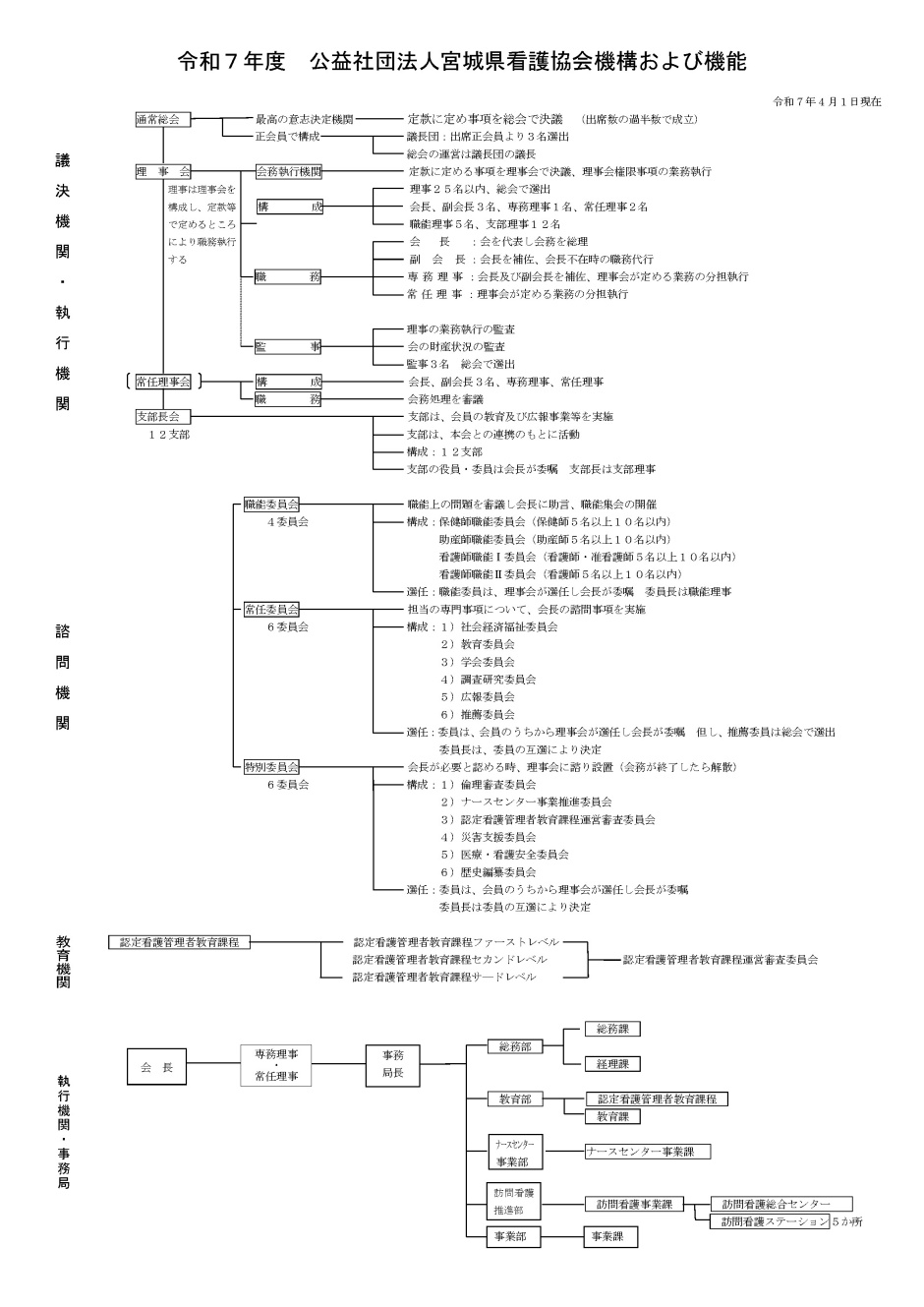 本会は、公益社団法人日本看護協会との連携のもと、保健師、助産師、看護師及び准看護師(以下「看護職」という。)が、教育と研鑽に根ざした専門性に基づき看護の質の向上を図るとともに、安心して働き続けられる環境づくりを推進し、あわせて宮城県民(以下「県民」という。)のニーズに応える看護領域の開発・展開を図ることにより、県民の健康な生活の実現に寄与することを目的とする。