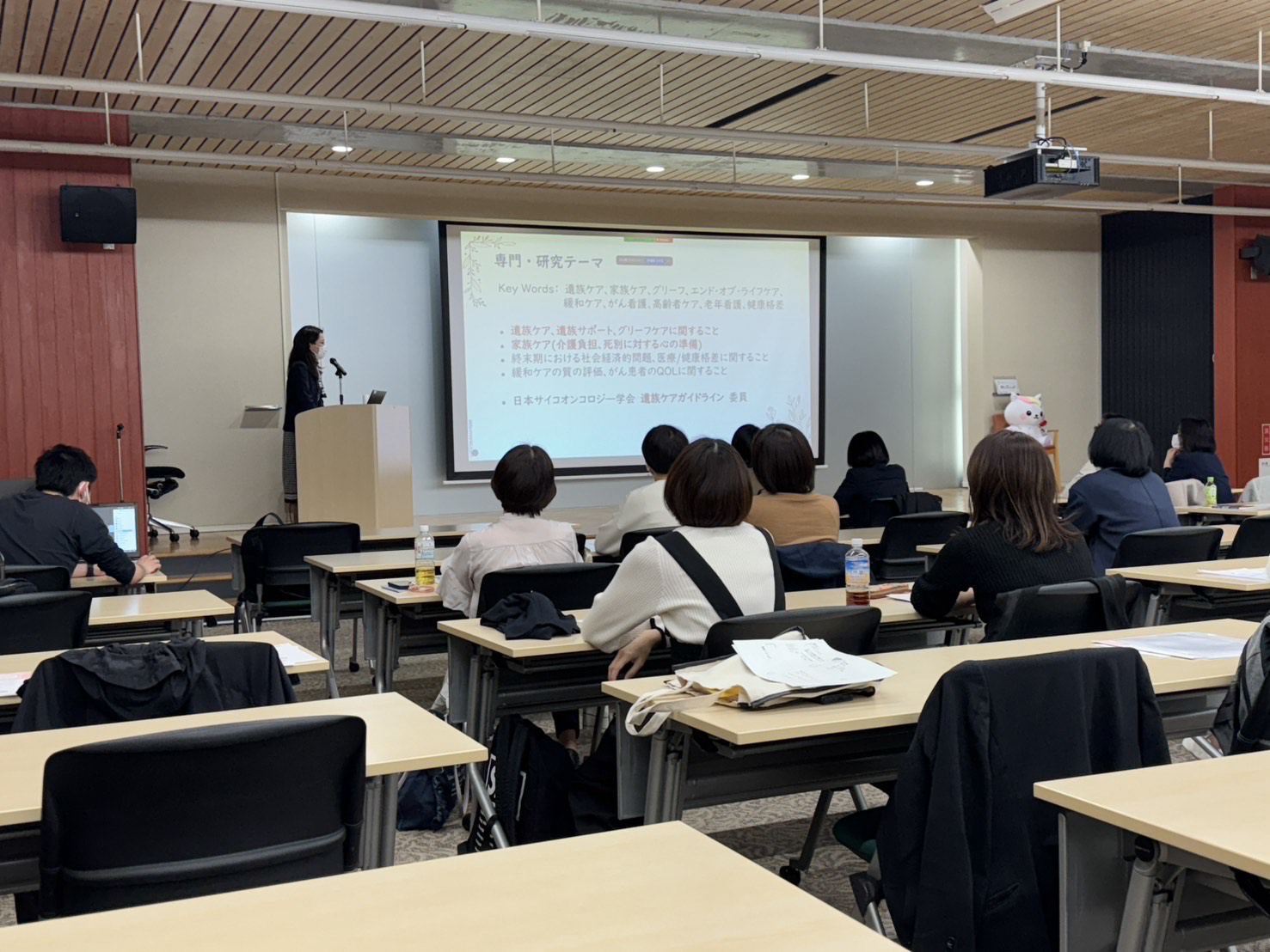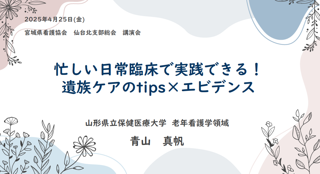 令和7年4月25日(金)に、令和7年度仙台北支部講演会が開催され、39名(現地参加24名、WEB参加15名)の方々にご参加いただきました。今回の講演会では「忙しい日常臨床で実践できる!!遺族ケアのtips×エビデンス」をテーマに、山形県立保健医療大学老年看護学分野教授の青山真帆先生よりご講演いただきました。